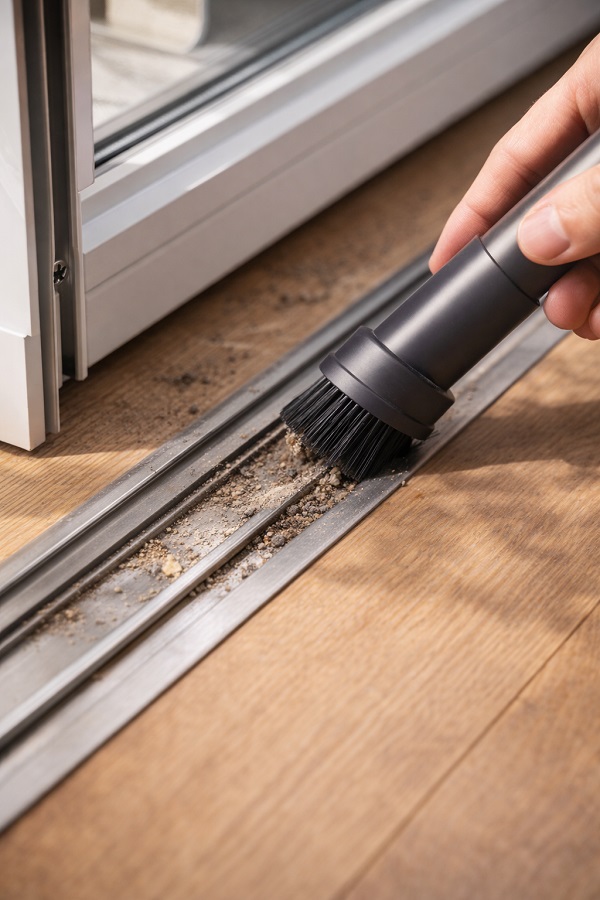 При плъзгащи врати най-важно е релсите да са чисти. Прахът и косъмчетата са „пясъкът в обувката“ на плавното плъзгане. Периодично минаване с прахосмукачка или суха четка прави чудеса.