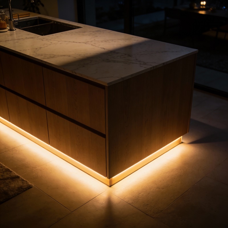 Една от най-силните смарт добавки в кухнята е дискретното LED осветление. То променя атмосферата и функционалността повече от която и да е видима джаджа.