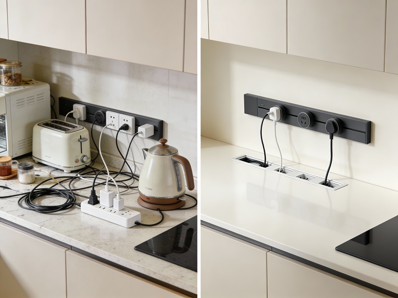 В много кухни най-големият визуален проблем са кабелите и разклонителите. Блендерът, кафемашината, тостерът — те винаги се появяват върху плота, но рядко имат място, което да изглежда подредено и замислено за тях.
