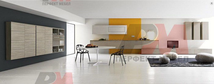 ✔ Дизайн и стил: Минималистичен, модерен стил с подчертани хоризонтални линии, изчистени форми и стилна геометрия. Цветовата палитра включва фино дървесно фладерно покритие, гланцирани фронтове и наситени жълти елементи – топъл акцент в модерния минимализъм.