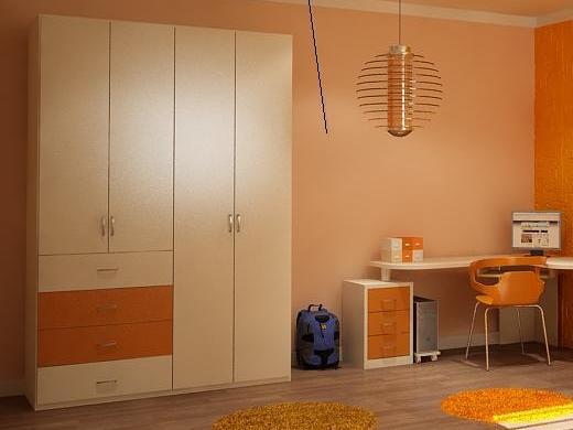 ✔ Гардероб с четири крила и вградени чекмеджета – изчистен дизайн, съчетаващ бяло и оранжево, предлагащ оптимално пространство за дрехи и аксесоари.