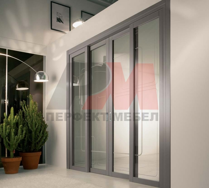 Елегантна плъзгаща се портална интериорна врата с алуминиева рамка и стъклени панели. Тази врата е идеален избор за модерни интериори, като осигурява максимална светлина и визуална лекота в пространството. Изчистените линии и сивият метален завършек създават усещане за минимализъм и стил, което я прави подходяща както за жилищни, така и за офисни помещения.
