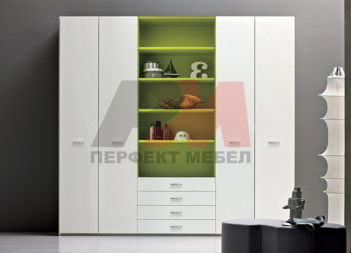 Този стилен и модерен гардероб по проект съчетава практичност и артистичен акцент. Централната открита част с контрастен лайм-зелен гръб се превръща в живо пано, внасящо свежест и игра на цветове в интериора.