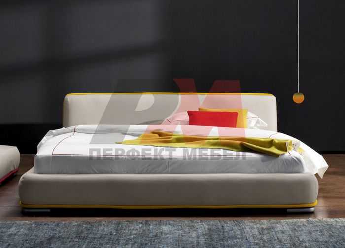 Спалнята носи духа на съвременния минимализъм, в който всяка извивка има своята логика и красота. Меката, изцяло тапицирана структура сякаш прегръща пространството, а изчистеният силует подчертава модерната ѝ визия. Деликатният кант в слънчево жълт оттенък обгръща спалнята като светлинен контур – акцент, който придава характер и настроение.